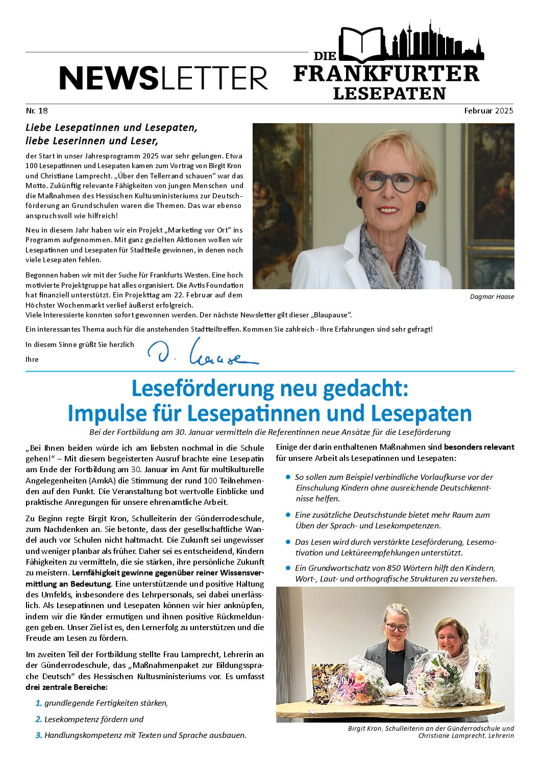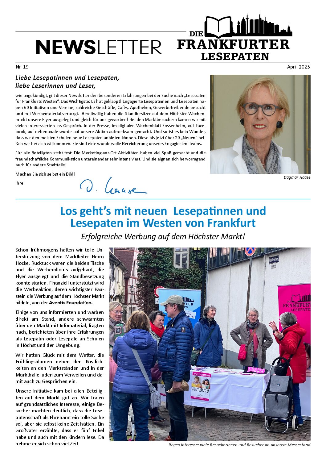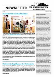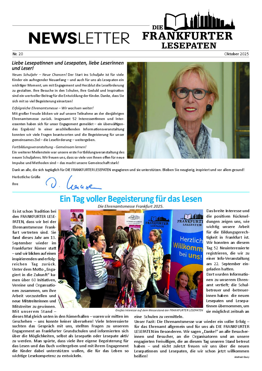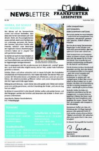 Wir nutzen auf unserer Website den Webanalyse-Dienst „Matomo“ zur statistischen Analyse der Website-Nutzung. Dabei werden durch Technologien wie „Cookies“ oder „Browser-Fingerprinting“ auch Informationen auf den Endgeräten der Nutzer gespeichert oder es wird auf solche Informationen zugegriffen. Anschließend werden diese zur Webanalyse verarbeitet. Weitere Informationen zur Funktionsweise und der Speicherdauer finden Sie in unserer Datenschutzerklärung. Mit der Auswahl „Matomo akzeptieren“ stimmen Sie der Nutzung des Webanalyse-Dienstes „Matomo“ auf der Website der FRANKFURTER LESEPATEN zu. Diese Einwilligung ist freiwillig, für die Nutzung der Website der FRANKFURTER LESEPATEN nicht erforderlich und kann jederzeit für die Zukunft unter Zustimmung Verwaltung widerrufen werden.