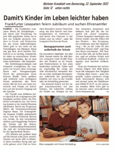 Wir nutzen auf unserer Website den Webanalyse-Dienst „Matomo“ zur statistischen Analyse der Website-Nutzung. Dabei werden durch Technologien wie „Cookies“ oder „Browser-Fingerprinting“ auch Informationen auf den Endgeräten der Nutzer gespeichert oder es wird auf solche Informationen zugegriffen. Anschließend werden diese zur Webanalyse verarbeitet. Weitere Informationen zur Funktionsweise und der Speicherdauer finden Sie in unserer Datenschutzerklärung. Mit der Auswahl „Matomo akzeptieren“ stimmen Sie der Nutzung des Webanalyse-Dienstes „Matomo“ auf der Website der FRANKFURTER LESEPATEN zu. Diese Einwilligung ist freiwillig, für die Nutzung der Website der FRANKFURTER LESEPATEN nicht erforderlich und kann jederzeit für die Zukunft unter Zustimmung Verwaltung widerrufen werden.